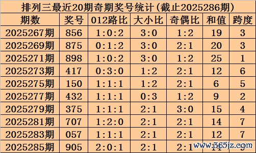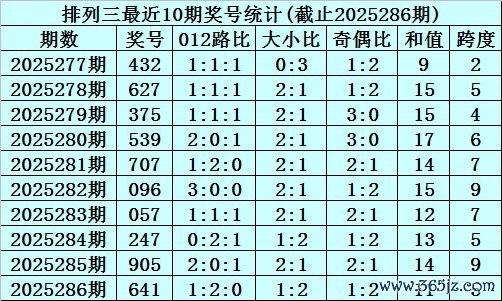 上期总结:成列三2025286期奖号为641,奇偶比为1:2,大小比为1:2,跨度为11。